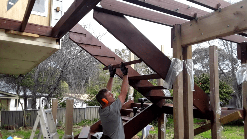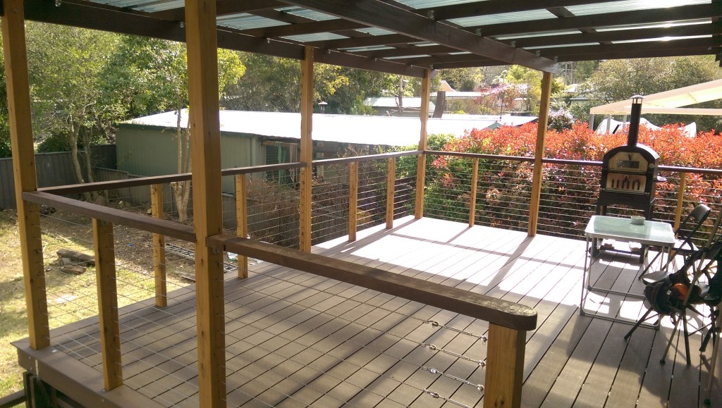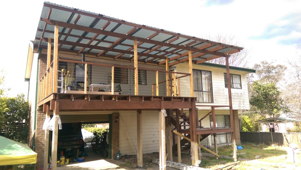 The stairs were then installed to provide access to the upper level, and then the joists were hoisted up, slotted into place, nesting happily in the existing slots in the house wall, spanning out over the new beams where the were then fixed into place with triple grips and at least a years supply of nails. Ekodeck+ decking boards were installed next followed by the upper veranda posts, rafters and polycarbonate roof sheets. The final trimmings included installing the stainless wires and finishing up with the oiling of the cypress posts, and staining of the treated pine posts